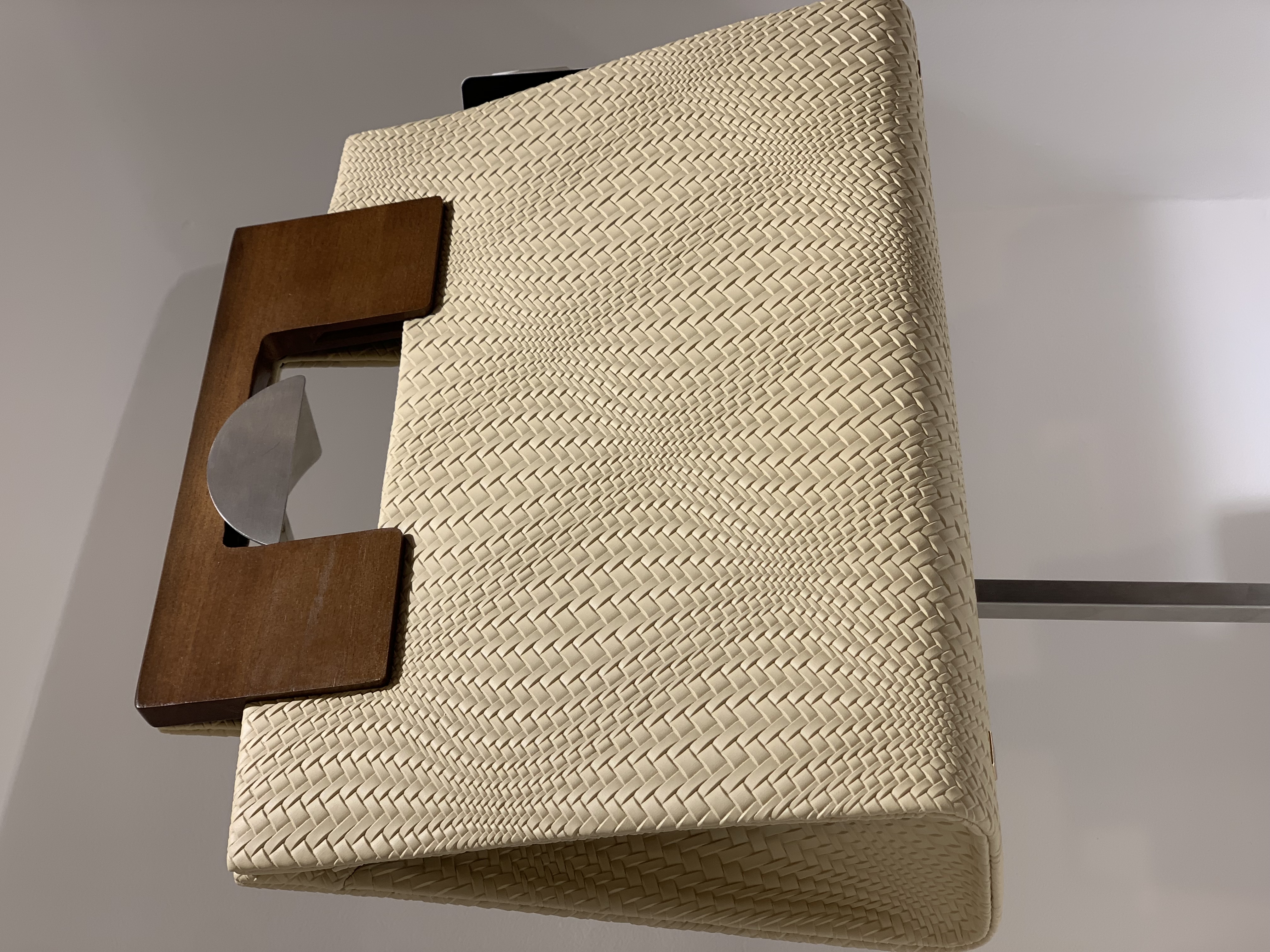 طراحی خاص با دسته مکعبی از چوب گردو و بدنه چرم مصنوعی طرح حصیری به رنگ شیری. فرمی ساختارمند و خوشدست، مناسب استفاده دستی بدون بند بلند. انتخابی متفاوت برای استایلهای خاص