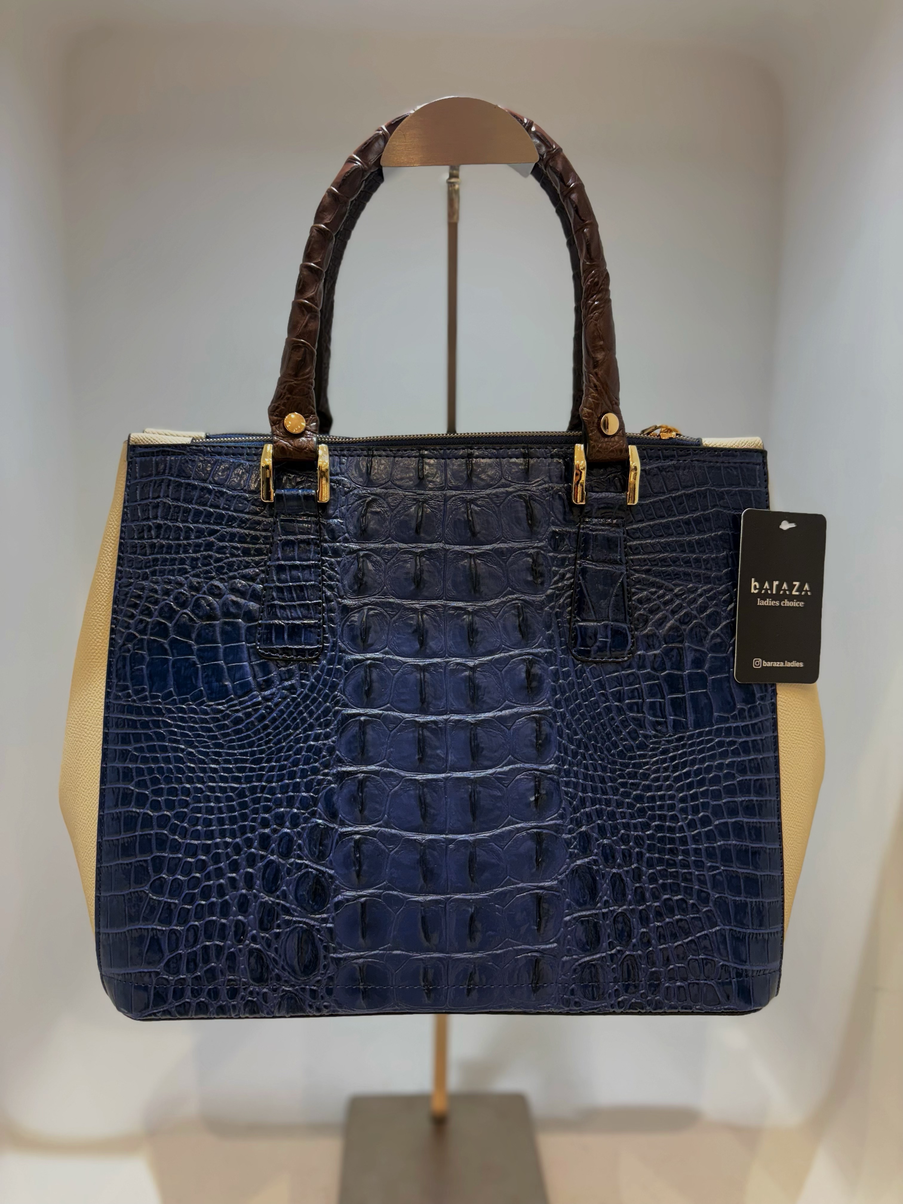 طراحی ترکیبی از چرم مصنوعی ساده و طرح پوست ماری در هارمونی رنگ سورمهای و کرم. دارای دسته کوتاه برای حمل دستی با جلوهای شیک و کاربردی و کیفیت بی نظیر